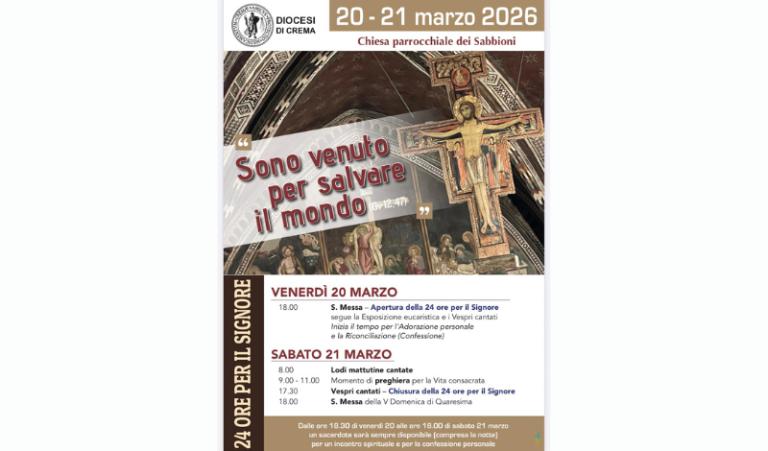 18.00 Eucarestia di apertura delle “24 ore”. Segue Esposizione Eucaristica e Vespri cantati.
