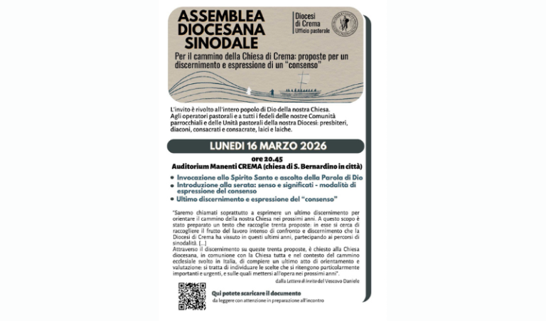 Lunedì 16 marzo 2026, alle ore 20.45, la Chiesa di Crema si ritroverà per l’Assemblea diocesana sinodale, convocata presso la Chiesa di San Bernardino (Auditorium Manenti) a Crema. Sarà un appuntamento particolarmente significativo, perché rappresenta il momento conclusivo del percorso di ascolto, confronto e discernimento che la diocesi ha vissuto in questi anni, in sintonia con il Sinodo dei Vescovi e con il Cammino sinodale delle Chiese in Italia.
