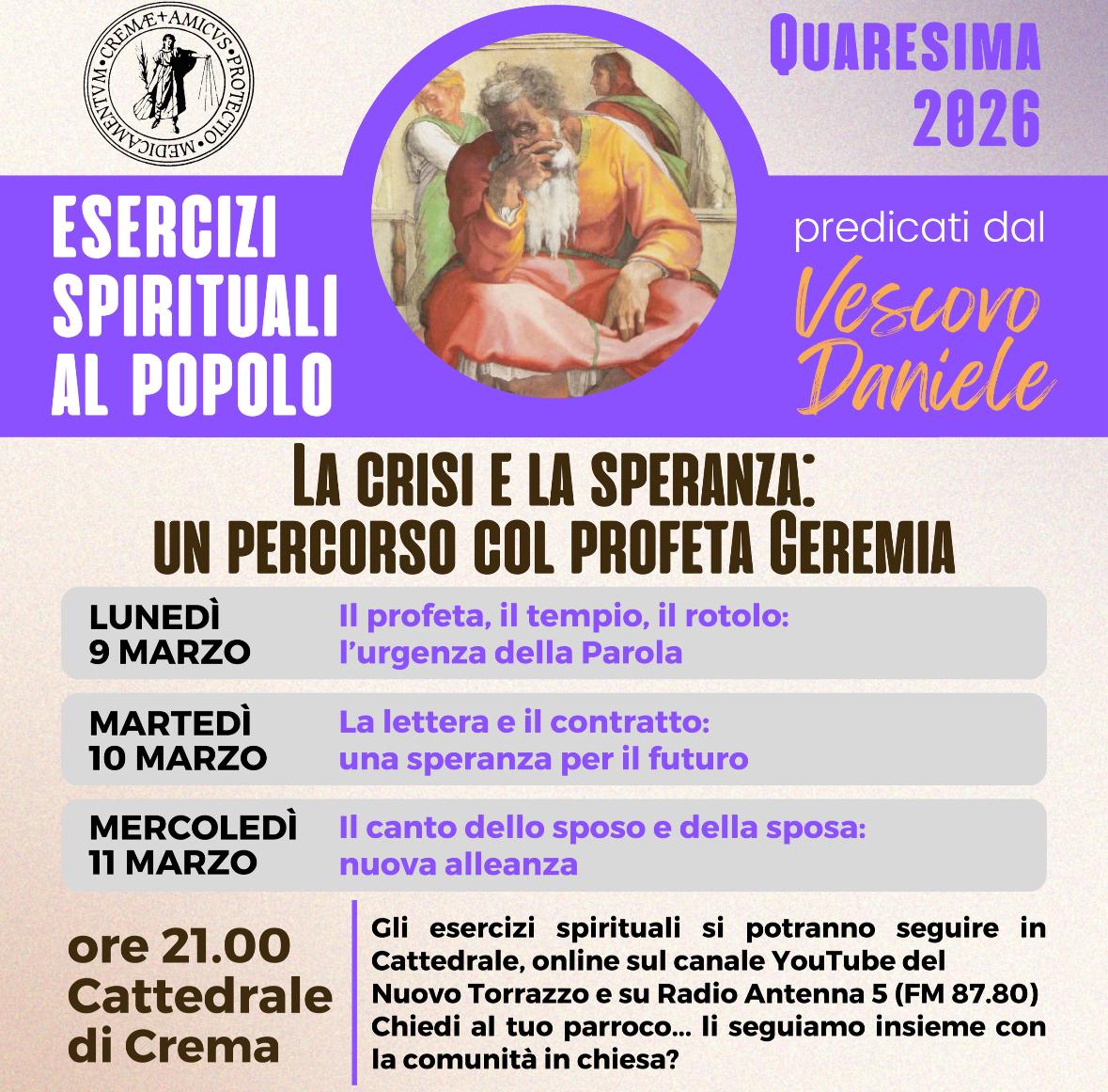In allegato la locandina degli Esercizi spirituali al popolo predicati dal vescovo Daniele nei giorni di 9-10-11 marzo alle ore 21.00 in Cattedrale.