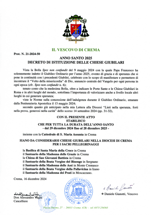 Sebbene le Porte Sante siano soltanto quelle delle quattro Basiliche Papali maggiori a Roma, nella diocesi di Crema sono stati scelti come giubilari e meta di pellegrinaggio alcuni luoghi particolari, a cui è connessa l’Indulgenza giubilare, presso i quali è utile portarsi come comunità, come gruppi o come singoli, per vivere la fede e le sue sorgenti, l’esperienza del cammino e della penitenza, la storia della Chiesa, così come le attenzioni spirituali, caritative e formative già ricordate dalla Bolla Spes non confundit.
